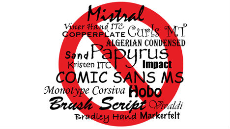 看 在上帝的份上,請不要再使用 Papyrus, Curlz MT 或Comic Sans 字體。這些字體被全球各地的設計師們嘲弄,還是很有原因的。教師間的個人溝通中,這些可能是不錯的選擇,但是卻與圖形設計毫無淵源,更不用說是要用在你最 重要的公司品牌中了。過份使用和造做的字體,尤其是其中的免費變體,不會為你的企業標識增色。這種設計自身仿佛會對你說“我是業餘設計師設計的”。