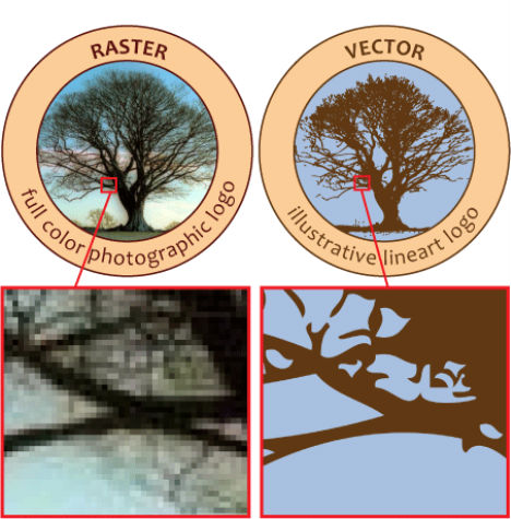 這種情形中最大的錯誤在於使用了光柵圖而非向量圖。前者由很小的點組成,放大後會很模糊。後者則可以縮放而不影響效果。不支援向量圖的程式,如Photoshop ,不應該被用於創建logo.